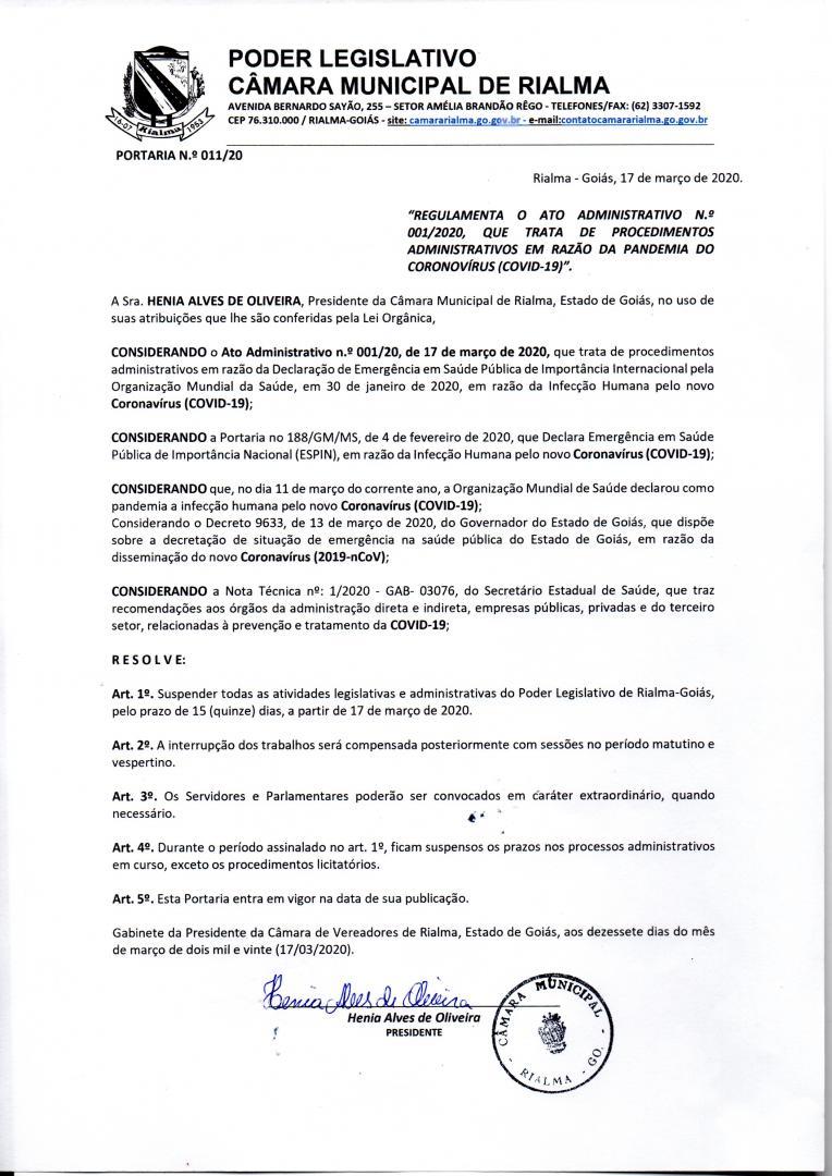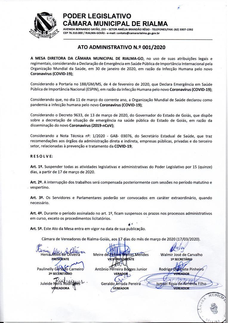 A MESA DIRETORA DA CÂMARA MUNICIPAL DE RIALMA-GO, considerando a Declaração de Emergência em Saúde Pública de Importância Internacional pela Organização Mundial da Saúde, em 30 de janeiro de 2020, em razão da Infecção Humana pelo novo Coronavírus (COVID-19); considerando a Portaria no 188/GM/MS, de 4 de fevereiro de 2020, que Declara Emergência em Saúde Pública de Importância Nacional (ESPIN), em razão da Infecção Humana pelo novo Coronavírus (COVID-19); considerando que, no dia 11 de março do corrente ano, a Organização Mundial de Saúde declarou como pandemia a infecção humana pelo novo Coronavírus (COVID-19); considerando o Decreto 9633, de 13 de março de 2020, do Governador do Estado de Goiás, que dispõe sobre a decretação de situação de emergência na saúde pública do Estado de Goiás, em razão da disseminação do novo Coronavírus (2019-nCoV); considerando a Nota Técnica nº: 1/2020 - GAB- 03076, do Secretário Estadual de Saúde, que traz recomendações aos órgãos da administração direta e indireta, empresas públicas, privadas e do terceiro setor, relacionadas à prevenção e tratamento da COVID-19;