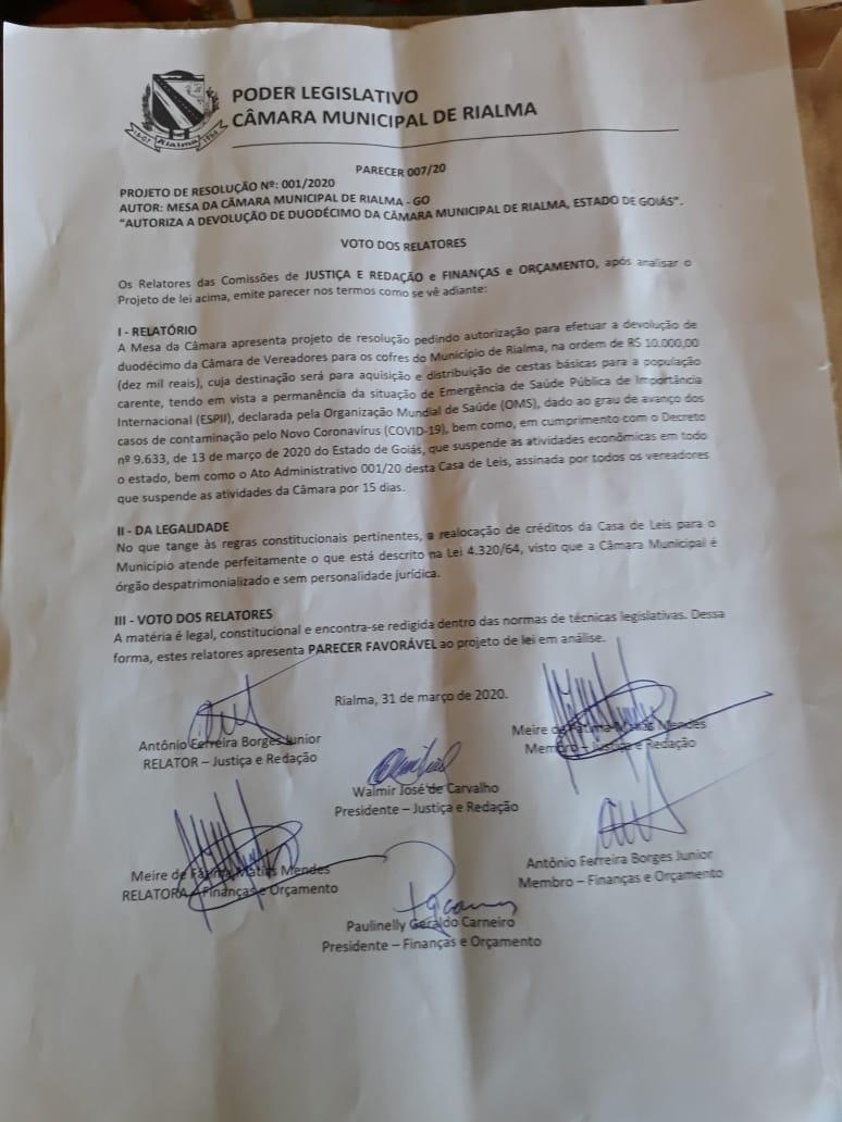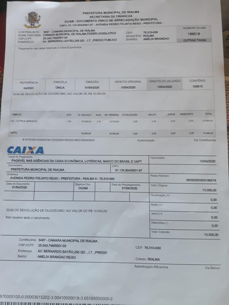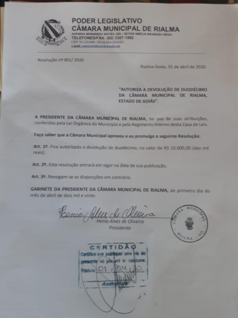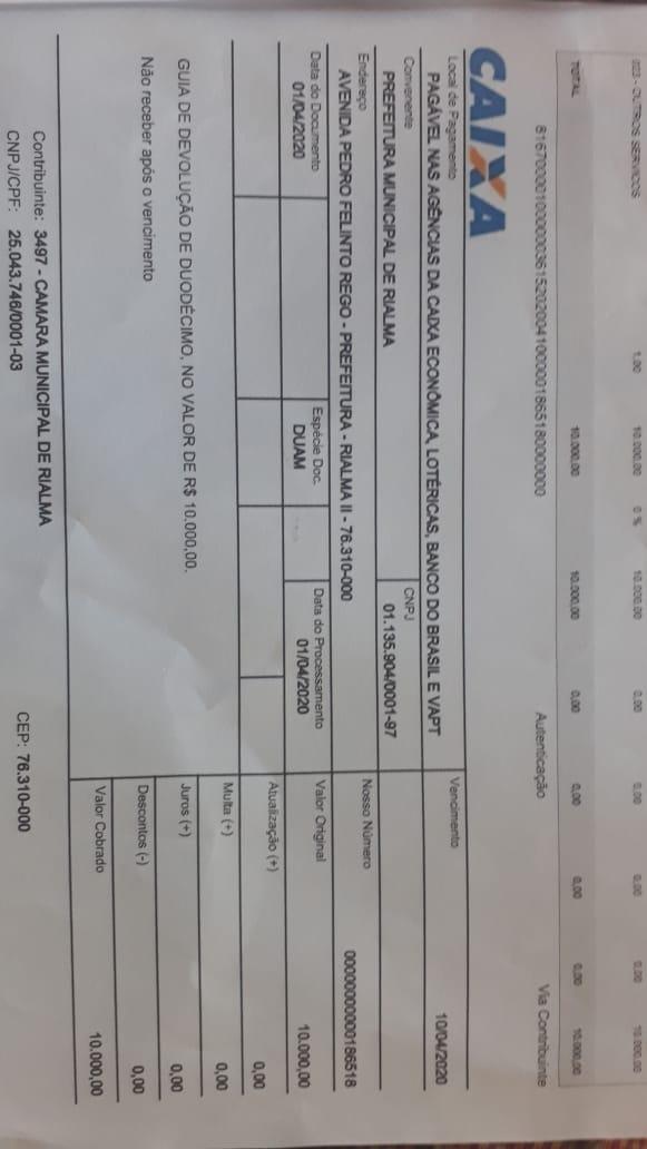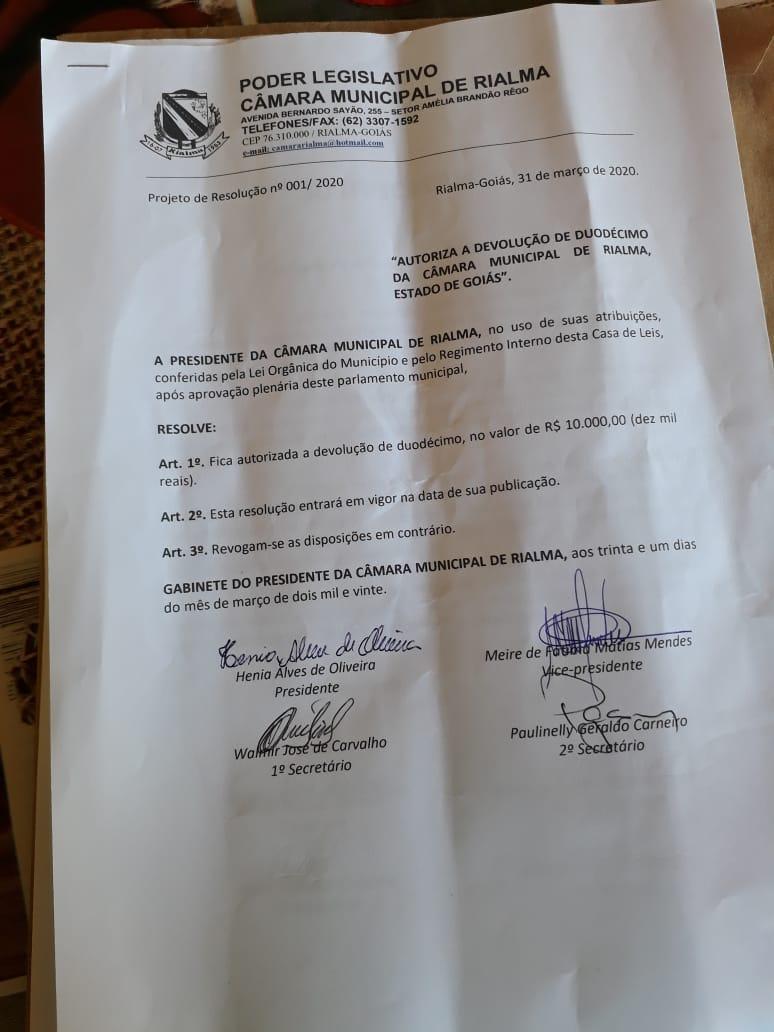 devolução de duodécimo para os cofres do Município de Rialma, na ordem de R$